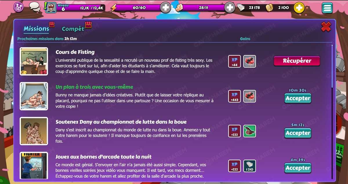 Il est à noter qu’au quotidien, dans Gay harem vous propose plusieurs mode de jeu pour évoluer. Tout d’abord dans le pachinko vous allez avoir droit à des cadeaux et des mecs gratuits. Ensuite dans vos missions quotidiennes vous allez pouvoir remplir des quêtes pour gagner des récompenses. Selon les jours et les missions vous allez pouvoir gagner des objets, de l’expérience, mais aussi parfois quelques kobans qui sont la monnaie du jeu.